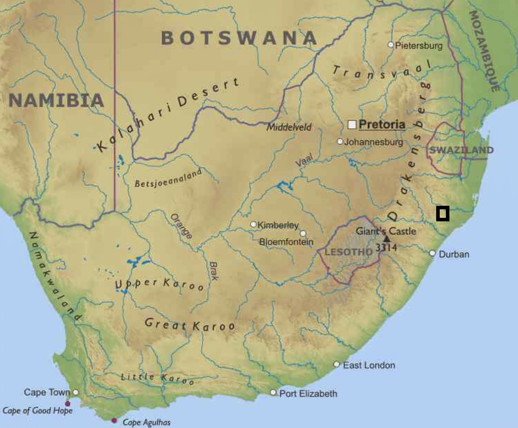 • KwaZulu Natal Province near the Ngoye Forest as well as on both sides of the border with Swaziland in the vicinity of the Josini dam and towns of Mkuze and Ubombo.