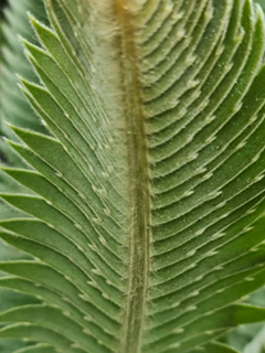 The leaves are straight with a dark green colour on the upper side and a lighter green on the lower side. Leaflets shield one another incubously in the distal part of the leaf and succubously in the proximal half of the leaf.