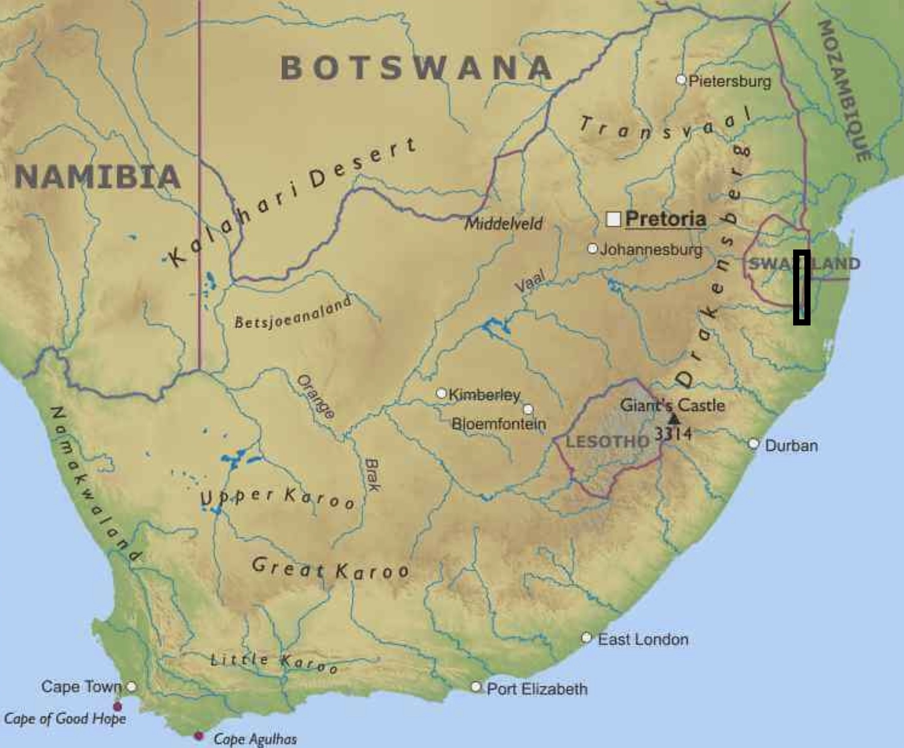- KwaZulu Natal Province from the area around the Jozini dam into Swaziland to the Siteki area.